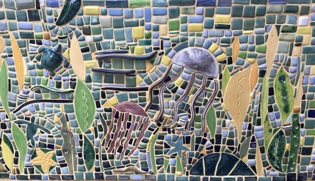 Bauer hace sus mosaicos extendiendo y moldeando arcilla húmeda, usando cosas como cajas de leche antiguas para hacer ciertas formas. El propietario solicitó temas acuáticos, por lo que Bauer esculpió un pulpo y una medusa, entre otros, y luego los glaseó y coció al horno. Creó el mosaico a partir de estos componentes personalizados en su estudio sobre malla de fibra de vidrio. Luego instaló el trabajo final en secciones en el sitio, utilizando un mortero de capa delgada sobre el banco Faswall. Finalmente, el proyecto se rejuntó con una lechada exterior adecuada.