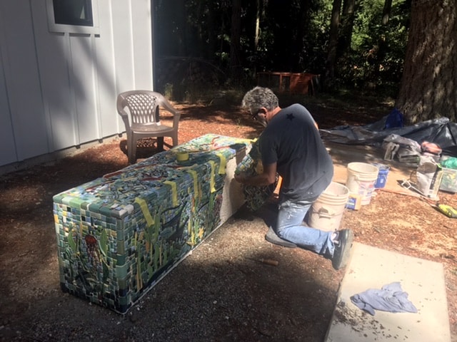 Bauer fabrique ses tuiles en roulant et en façonnant de l'argile humide, en utilisant des choses comme des caisses à lait antiques pour créer certaines formes. Le propriétaire a demandé des thèmes aquatiques, alors Bauer a sculpté une pieuvre et des méduses, entre autres, puis les a émaillés et cuits au four. Il a créé la mosaïque à partir de ces composants personnalisés dans son studio sur un treillis en fibre de verre. Il a ensuite installé le travail final par sections sur le site, en utilisant un mortier mince sur le banc Faswall. Enfin, le projet a été scellé avec un coulis extérieur approprié.
