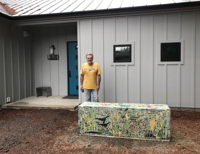 Y a-t-il autre chose qui peut être fait avec les matériaux de construction Faswall autre que la construction de maisons ou de bâtiments ? Oui! Dans le cas d'un propriétaire avec une maison Faswall à Washington, un banc de mosaïque extérieur était le point focal d'entrée parfait. Frank Bauer est un artiste céramiste qui fabrique ses propres carreaux pour son art. Le propriétaire a découvert l'art de Frank alors qu'il vivait à Venise et lui a commandé un banc avant même que la construction de la maison ne commence.